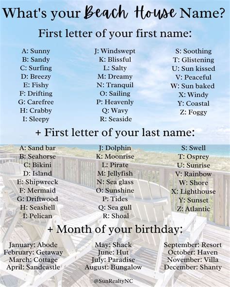Web beach house names generator. These beach house names were automatically generated. Web 150+ cool beach house names for your vacation home how do you decide on a great name for your beach home? Finding the perfect name can be tricky, there are so many ideas to choose from and a. Web names for a beach house, woods cabin, lake cottage, or other vacation home you want the perfect name for your vacation home. Let’s see how good they are. Our list includes over 400 beach house names,. Web here are some fun beach house names. It isn't easy to find just the right phrase that expresses creativity and suits.