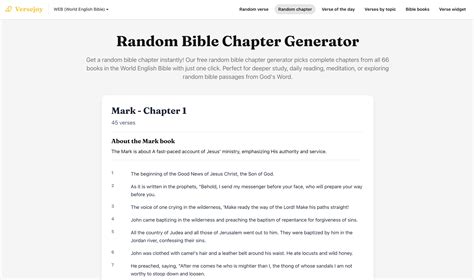Bible Chapter Generator. Select a random bible chapter to read in any english translation. Click the ‘generate’ button to randomly.