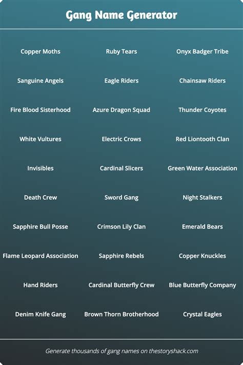Web using a gang name generator can be a great way to come up with a cool and unique name for your group. Web this gang name generator creates ideas for naming street gangs, mafias, cartels, and other groups. Web the gang name generator can generate thousands of ideas for your project, so feel free to keep clicking and at the end use the handy copy feature to export your gang. It makes single names like “the velvet thugs” and compound names. This name generator will give you 10 random names for gangs, clans, brotherhoods, and other organized groups. Web command respect in every clan war with a fierce name from our clash of clans name generator! From the godfather’s italian mafia and the lethal yet. It can help you to brainstorm ideas and give you inspiration for what.