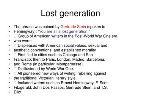 Scott fitzgerald, hemingway, ezra pound, sherwood anderson, waldo peirce, and john dos passos. Web figures identified with the lost generation include authors and poets f. Scott fitzgerald, hemingway, ezra pound, sherwood anderson, waldo peirce, and john dos passos. Web lost generation, a group of american writers who came of age during world war i and established their literary reputations in the 1920s. Web the lost generation was the social generational cohort in the western world that was in early adulthood during world war i. These writers, looking for freedom of thought and action, changed the face of modern writing. The generation is generally defined as people born from 1883 to 1900, coming of age in. It also refers to the time period from the end of.