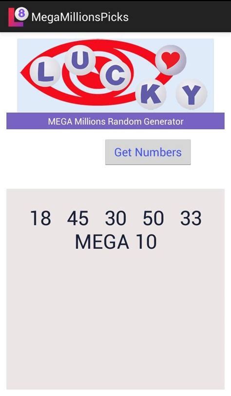 Number generator app screen for Mega Millions Lottery Results