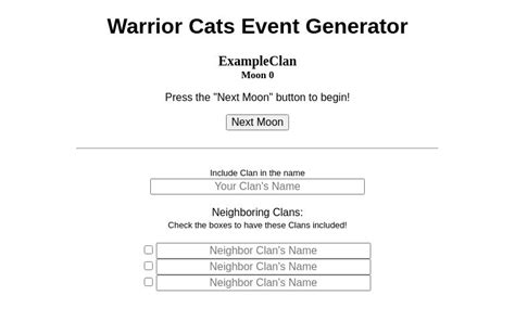 Warrior Cats Event Generator. Web warrior cats event generator moon 0 riverclan riverclan absorbs the other clans each time you click 'next moon' an event.