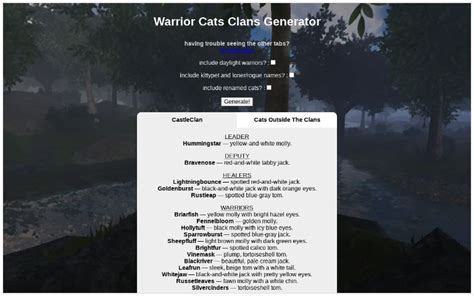 Warriors Clan Generator. Web info (click to read) hello, i'm raggedflight! You can tap/click the cats' prefixes, suffixes, and traits, as well as the clan names, to individually randomize them.