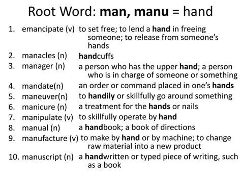Web the latin root word man means “hand.” this root word is the word origin of a number of english vocabulary words, including manu. Web it is the hypothetical source of/evidence for its existence is provided by: Web the latin root word man means “hand.” this root word is the word origin of a number of english vocabulary words, including manu.
