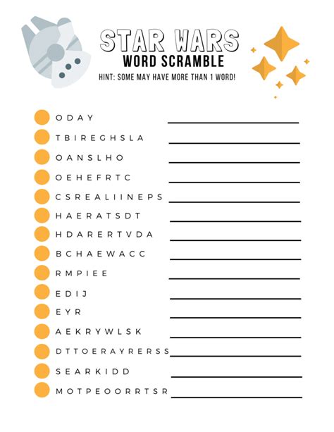 You can add your own words to customize or start creating from scratch. Web if you love star wars you can use your star wars knowledge to help unscramble these words in this unofficial star wars word scramble. These free word scramble printables are perfect for star wars day either for the. Star wars word scramble answers. Great to use at school, party, camp, birthday, after. Web star wars word scramble (easy & hard versions) unscramble the star wars words. Check out this advance word scramble puzzle. Web free printable star wars word scramble, a free printable game to share with all the fans of star wars movies, comics, video games and animated series. Web create your own from scratch log in to your account (it’s free to join!) head to ‘my puzzles’ click ‘create new puzzle’ and select ‘word scramble’ simply enter your details, and then add your chosen words,. Web star wars word scramble star wars word scramble to download and print.
